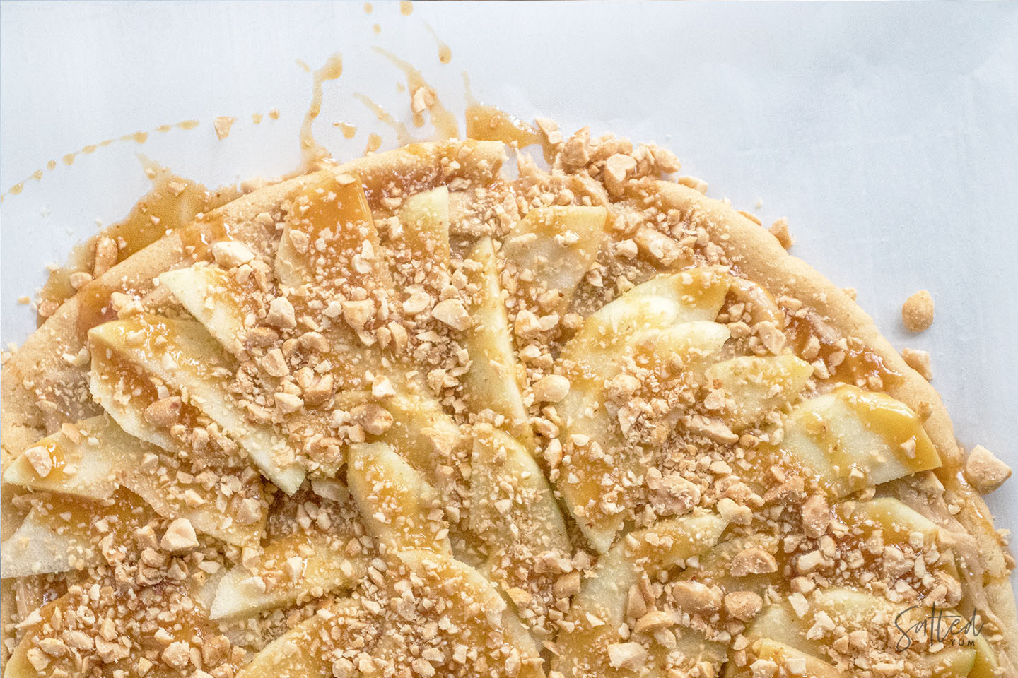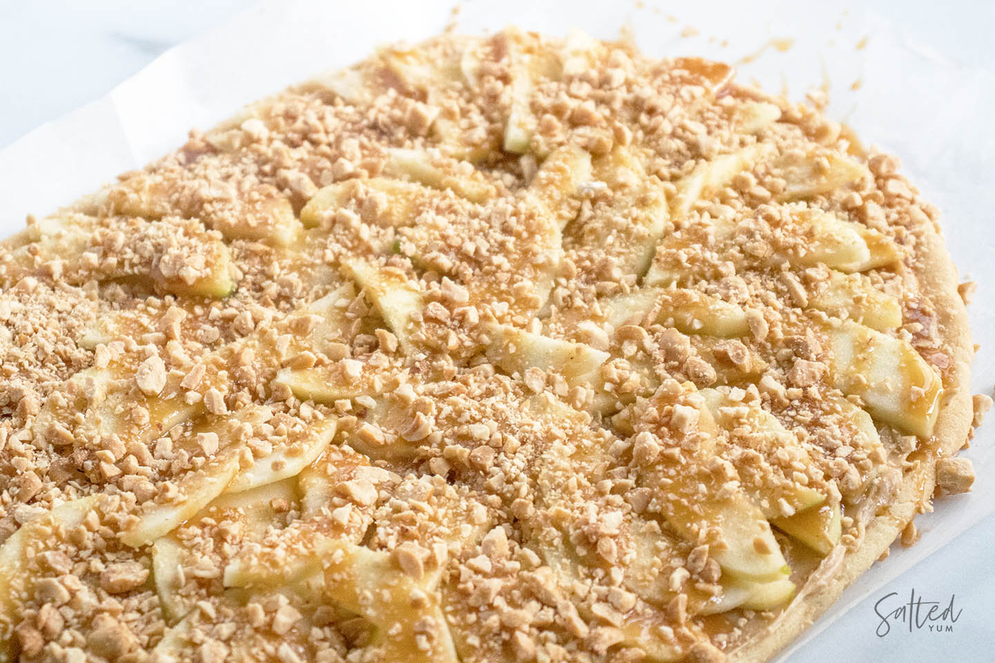 - Arrange the apple evenly over the cream cheese mixture. Drizzle the caramel topping over the apples and top with chopped peanuts.